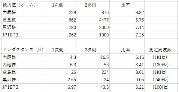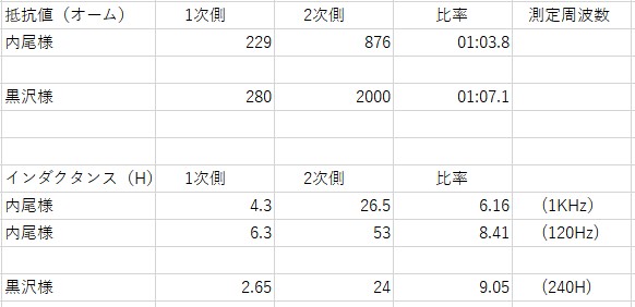 抵抗値では内尾さんのトランスが一番(1:3)に近い結果ですね。